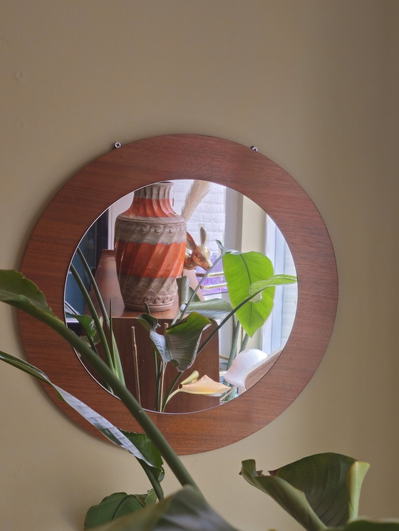 Miroir rond vintage en placage de teck avec deux crochets de suspension.