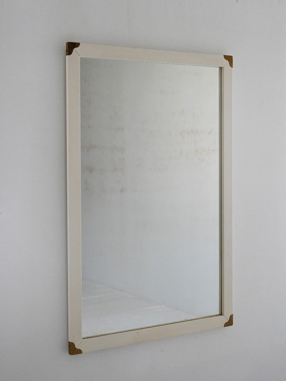Miroir mural des années 1950 avec cadre en bois laqué blanc et détails d'angle en laiton.