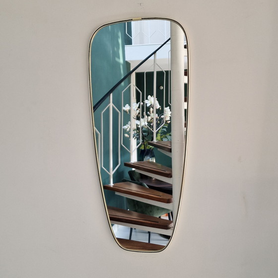 Un beau miroir vintage des années 1950-1960. Probablement fabriqué en Allemagne. Le miroir mural rétro est oblong/rectangulaire et présente un bord en laiton doré avec une bande noire. Le dos est en bois. La plaque du miroir présente de légères traces d'utilisation correspondant à son âge.