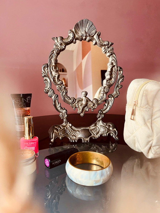 Magnifique miroir de coiffeuse dĂ©coratif italien en fonte, de style rococo. Son cadre ornĂ© est richement dĂ©corĂ© de chĂ©rubins, d'Ă©lĂ©gantes volutes et d'une coquille classique en partie supĂ©rieure. Typique du style romantique Louis XV/rococo. Ce miroir de table repose solidement sur un socle dĂ©corĂ© et son miroir est inclinable, ce qui le rend idĂ©al pour une coiffeuse, une table de maquillage ou comme objet dĂ©coratif dans un intĂ©rieur. Sa belle patine et la finesse de sa fonte lui confĂšrent un authentique charme vintage. H 32 cm x L 22 cm x Ă 15 cm Les couleurs sur la photo peuvent parfois diffĂ©rer de la rĂ©alitĂ© en raison de la lumiĂšre du soleil ou de la couverture nuageuse đ