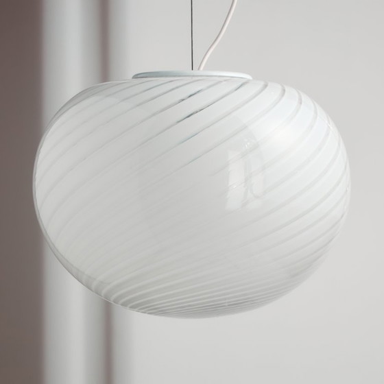 Suspension en verre de Murano datant des années 1970. L'abat-jour ovale en verre est décoré de motifs blancs et translucides, ce qui en fait un ajout intéressant à tout espace grâce à sa charmante lumière. Les parties en verre de la suspension sont en très bon état, les surfaces métalliques sont oxydées par endroits.