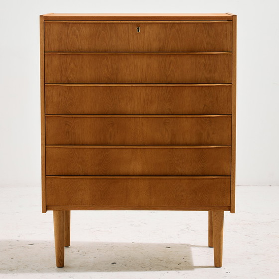 Commode en chêne danois restaurée avec six tiroirs et des poignées uniques datant des années 1960. Des tons de chêne captivants, des détails épurés et des tiroirs pratiques. La clé du tiroir est manquante.