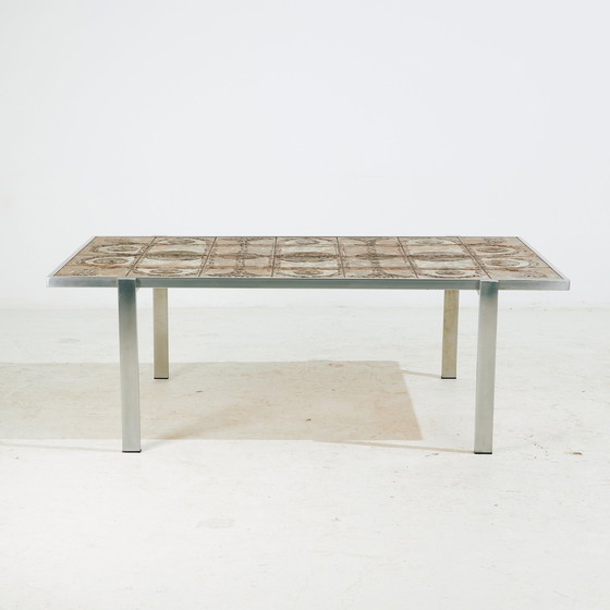 Table basse en acier avec de jolis détails et une incrustation en céramique, datant des années 1960. La surface en acier de la table présente des rayures et de l'usure par endroits, avec quelques signes d'utilisation. Les parties chromées de la surface sont oxydées.