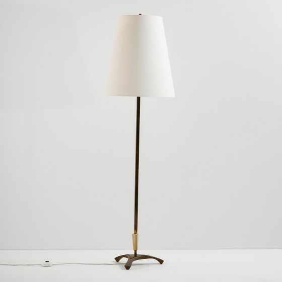 Une pièce classique et élégante. Lampadaire en laiton avec abat-jour en textile et formes angulaires, datant des années 1970. La surface en laiton est oxydée.