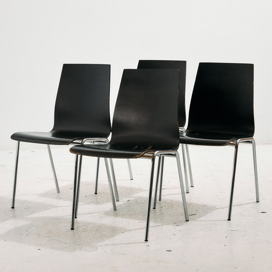 Chaise en hêtre sur base tubulaire des années 1970. La chaise est empilable, ce qui en fait un bon choix pour économiser de l'espace. Quelques rayures de surface, taches et usures sur les parties en bois et en chrome. 16 en stock