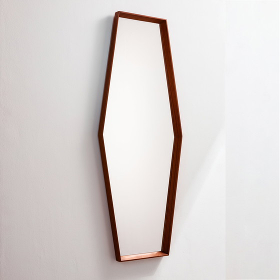 Miroir hexagonal encadré en teck des années 1960. Avec quelques rayures de surface, taches et usure sur les parties en bois, mais en bon état vintage.