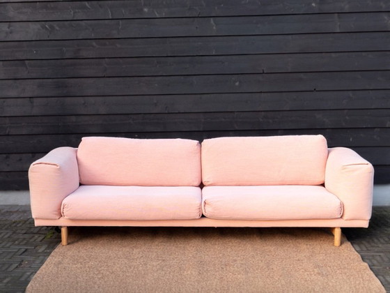 Canapé design Muuto Rest, signé Anderssen & Voll. Ce canapé 3 places est revêtu d'un tissu rose à motifs « steelcut trio ». C'est un canapé de très haute qualité qui vous accompagnera pendant de nombreuses années. 🛋️