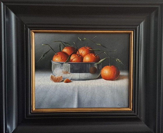 Ces oranges sont disposées dans un bol en argent, qui évoque l'atelier de l'artiste. L'ensemble dégage une impression de fraîcheur et de couleurs. Le peintre Rob Ritchie a créé cette œuvre sous forme d'oléographie et l'expose à l'échelle nationale et internationale. Le cadre, réalisé artisanalement, est orné d'une bordure dorée. La nature morte provient de Londres. Dimensions : 42 × 38 cm.