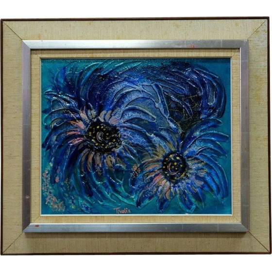Nature morte moderniste des années 60. La peinture est réalisée à l'huile sur panneau. Signée au bas de la peinture Thulin et signée à la main et décrite par l'artiste au verso. Dans un cadre d'époque original. La signature au dos (nom de l'artiste) est difficile à lire. Tableau typique du Mid Century Modern.