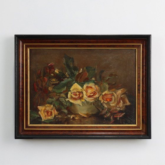 Peinture à l'huile représentant un vibrant bouquet de roses et d'autres fleurs délicates, élégamment encadrée dans un cadre en bois. La peinture et le cadre présentent de petites traces d'utilisation dues à l'âge.