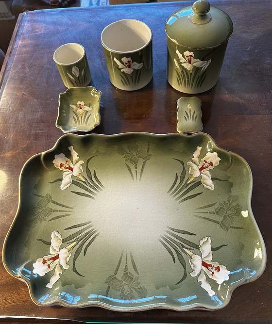 Entrez dans l'élégance du début du XXe siècle avec cet exquis "Nécessaire dit de Fumeur" de la célèbre Manufacture De Bruyn Faiencerie Fives Lille, vers 1920. Ce service en porcelaine, orné de délicats motifs floraux, incarne le style raffiné de l'Art nouveau, ce qui en fait un ajout distingué à toute collection.