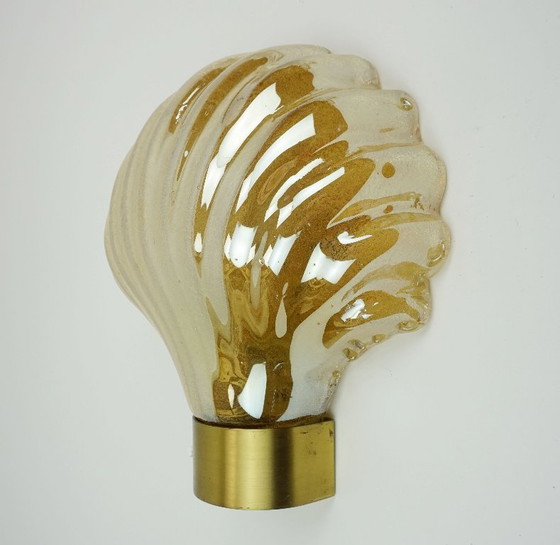 A very beautiful, large decorative wall lamp from the 1960s or 70s. The shell-shaped shade is made of lustrous glass with a smooth exterior and a textured interior, creating a lovely shimmering gold lighting effect. It features a brass and white metal wall bracket and accommodates two E27 bulbs. It is designed for direct wall connection without a switch on the lamp itself. There is an opening at the bottom of the lamp for a pull cord, and sufficient space inside the metal housing allows for the installation of a switch if desired. Bulbs are not included.