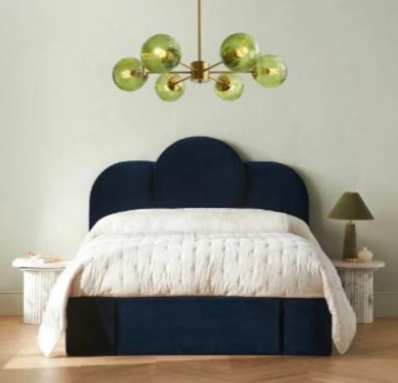 Ce lustre suspendu moderne en forme de globe doré est composé de six bras et de six boules de verre vertes. Le métal est électroplaqué et peint, ce qui lui confère une texture lisse et luxueuse. Le lustre Sputnik, avec son abat-jour en forme de globe de verre, dégage une impression de raffinement et d'élégance ; c'est une véritable œuvre d'art, bien plus qu'un simple luminaire décoratif.
