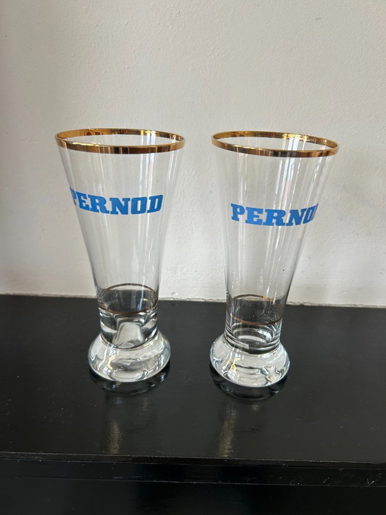 Verres Pernod vintage de collection, à bord doré et logo Pernod bleu. Hauteur : 14 cm, diamètre : 7 cm. Origine : principalement fabriqués en France dans les années 1960 et 1970. Magnifique ensemble avec la carafe à eau en céramique Pernod Fils (voir photo dans une autre annonce).