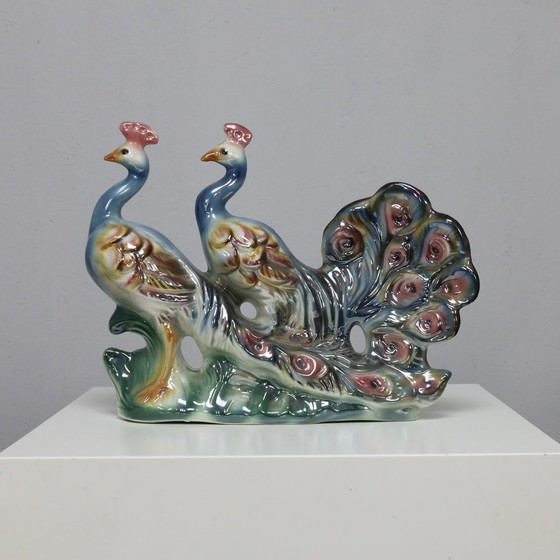 Objet en céramique italienne avec deux paons - années 1960, peint à la main, H 32 x L 42 x P 12 cm