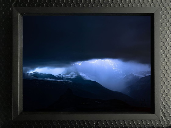 Capturez la puissance de la nature avec cette photographie en édition limitée, « Orage sur le Cervin ». Mesurant 23 x 30 cm, cette image saisissante est encadrée avec des matériaux de qualité muséale, ce qui lui assure une place de choix dans toute collection. Le jeu spectaculaire de lumière et d'ombre sur l'emblématique Cervin offre une expérience visuelle à couper le souffle. Un instant rare immortalisé par l'astrophotographe et artiste contemporaine Anna Dobrovolskaya-Mints.