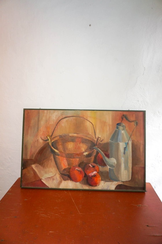 original 1960s oil still life painting * midcentury folk art kitchen scene with apples, basket and enamel jug * rustic eastern e