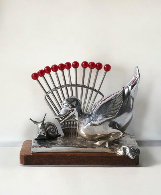 Servez votre prochain punch ou cocktail avec ces bâtonnets à cocktail uniques. Ils sont présentés de manière inoubliable sur un plateau en bois avec ensemble chromé. Le dessin a été réalisé par le caricaturiste animalier français Benjamin Rabier (1864-1939). Le motif est le canard Gédeon, l'un des personnages les plus connus de Rabier, qui court après l'escargot.