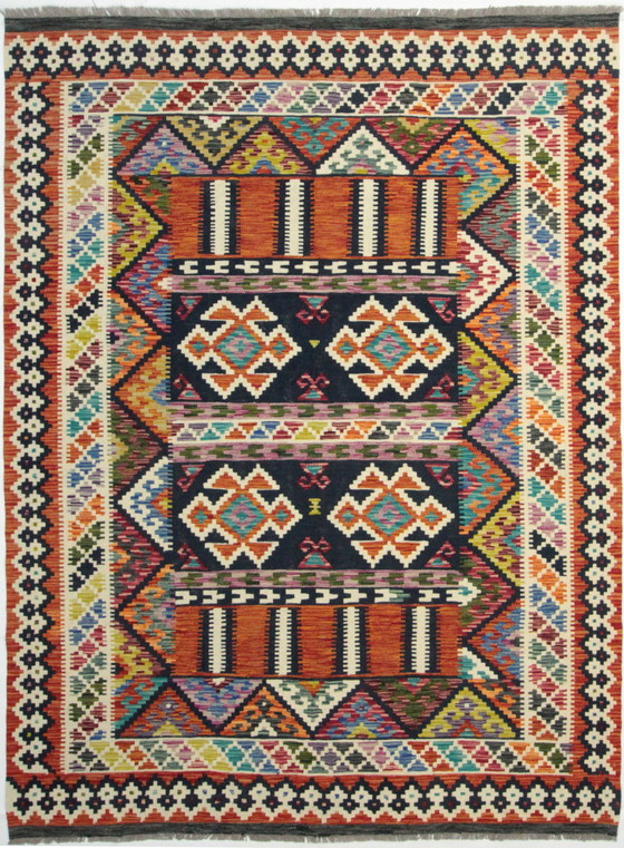 Les tapis Kilim Afghan sont tissés à la main par des Turkmènes dans le nord de l'Afghanistan. Une technique de tissage traditionnelle est utilisée pour créer le motif typique en escalier, caractérisé par un petit espace entre chaque bloc de couleur. Pour y parvenir, le tisserand renvoie la trame autour de la dernière chaîne d'une zone de couleur donnée, puis renvoie la trame de la couleur voisine autour de la chaîne adjacente. L'espace vide formé entre les deux espaces doit être visible, mais rester petit. Ces tapis sont remarquablement durables et pour s'assurer que la structure du kilim reste solide, le tisserand doit veiller à ce que la trame soit bien tassée et recouvre entièrement la chaîne. L'ancienne technique de tissage laisse au tisserand plus de liberté pour la créativité. Il en résulte des kilims aux couleurs naturelles et vives, avec des formes géométriques vives. Ils complètent parfaitement les maisons modernes et traditionnelles et, grâce à leur polyvalence, ils peuvent décorer les sols, les murs, les couvre-lits et les meubles de la même manière que les nomades les utilisaient à l'origine comme revêtements de sol, sacs ou rideaux pour les tentes. Outre leur polyvalence, les kilims sont réversibles et présentent le même motif des deux côtés. Cela signifie qu'ils peuvent être facilement retournés et utilisés lorsqu'ils sont sales ou tachés.