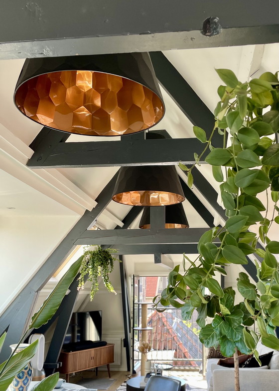 Ces lampes suspendues hexagonales ont été conçues par Osiris Hertman.
