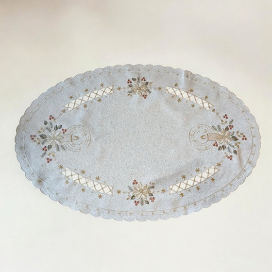 Ovale Vintage Weihnachts-Tischdecke von SANDER – Weiß mit grün/rot/goldenem Dekor