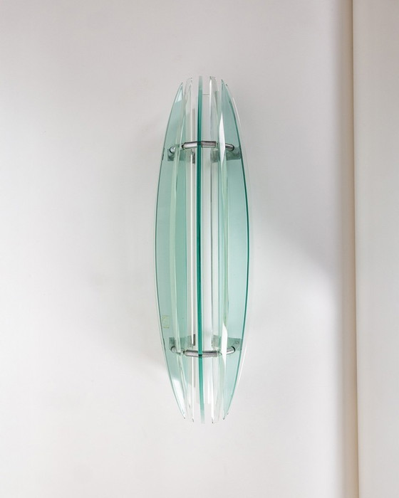 Applique murale avec cadre en métal chromé et plaques de verre transparent et vert, design Veca, années 1970.