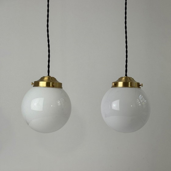 Lot de 2 suspensions rondes en opaline. Rosace de fixation en métal.
