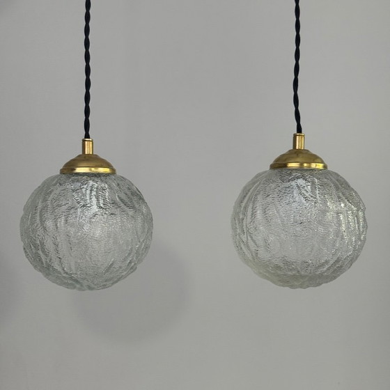 Lot de 2 suspensions rondes en verre texturé.Bel effet de lumière. Rosace de fixation en métal.