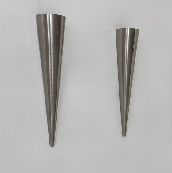 Paire d'applique composée d'une feuille de métal en forme de long cône, produite en France dans les années 80.