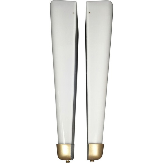 Produites en Italie entre les années 1950 et 1960, elles sont composées de plaques de verre acrylique blanc, façonnées et pliées pour créer deux grands cônes de lumière logés sur des bases massives en laiton.