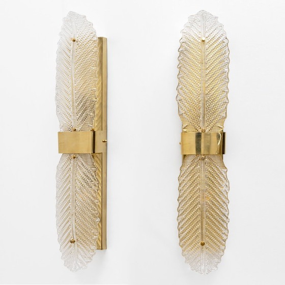 Appliques murales raffinées composées de deux éléments en verre de Murano travaillés avec de la graniglia, façonnés en forme de feuille stylisée. Le verre transparent présente une surface richement texturée, ornée de motifs géométriques et de minuscules reliefs qui diffusent une lumière douce et chatoyante, créant un effet décoratif du plus bel effet.