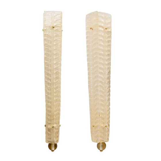 Paire d'appliques murales en verre de Murano Graniglia doré, ornées d'une texture en forme de feuille et d'une finition cristal dorée. Trois panneaux de verre allongés s'affinent vers le bas, se terminant par une sphère en verre soufflé. Les lampes sont équipées de trois douilles G9, câblées pour les États-Unis et certifiées UL, et portent le marquage CE pour l'Europe. Ce modèle ancien est toujours disponible ; d'autres paires sont donc disponibles ; veuillez nous contacter pour connaître les disponibilités.