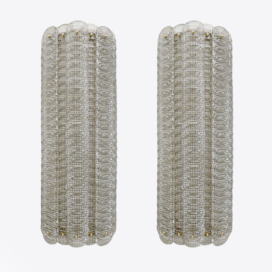 Superbe paire d'appliques en verre de Murano, chacune composée de huit lames imprimées d'un motif « Reticello » et d'une texture stylisée évoquant des plumes. L'effet obtenu leur confère l'aspect d'une peau de python ! Elles diffusent une lumière chaude et agréable. Chaque applique nécessite quatre ampoules à culot moyen et est câblée selon les normes américaines.