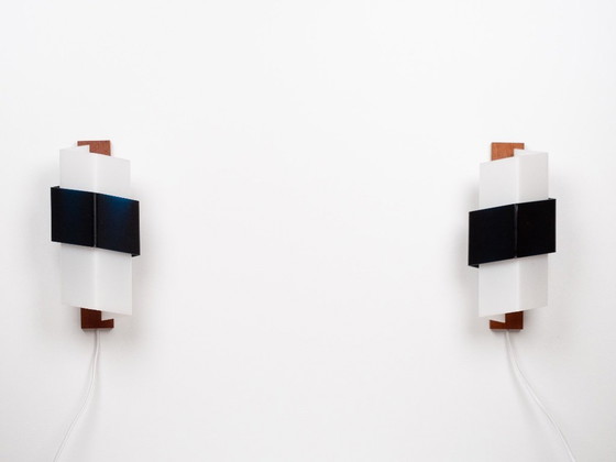 Paire d'appliques murales en plastique et bois de teck. Elles datent des années 1950.