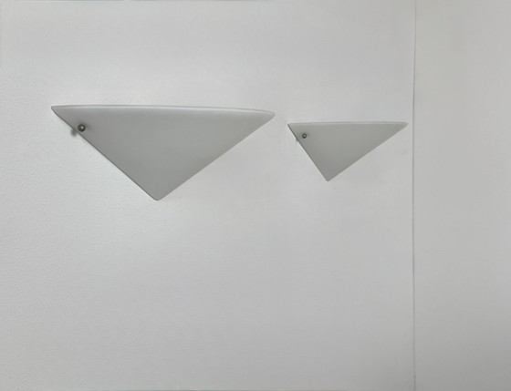 Paire d'appliques composée d'une structure en chrome et d'un diffuseur en opaline, produite en France dans les années 80.