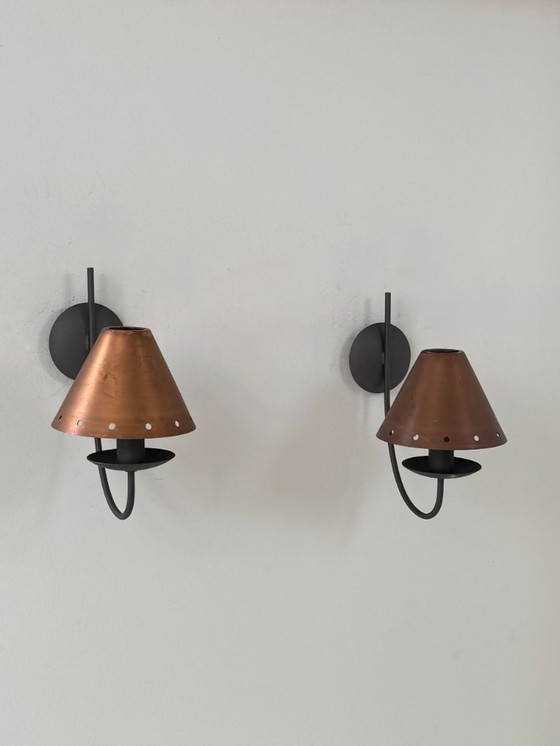 Paire d’appliques composée d'une structure en métal laqué noir et d'un diffuseur en cuivre, produite en France dans les années 70.