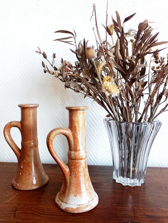 Paire de bougeoirs en grès émaillé marron glacé avec émaillage en coulure blanche, à pieds ronds et larges et à prise ronde latérale. Travail vintage vers 1950 / 1960. En parfait état. 20 x 9 cm. Envoi propre, rapide et soigné.