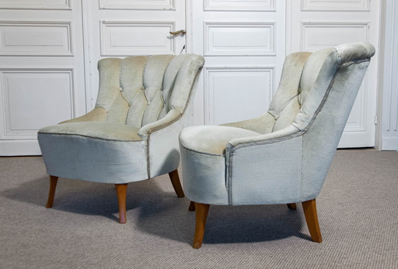 Paire de chaises "Slipper" vert clair de Suède, datant des années 1940. Les chaises sont tapissées de velours vert et ont un dossier joliment rembourré. Conçues pour offrir à la fois confort et soutien, elles constituent une option élégante et intemporelle.