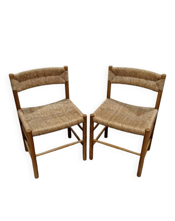Très jolie paire de chaises modèle Dordogne des années 1950. Fabrication française par l'éditeur Robert Sentou pour la designer française Charlotte Perriand. Dossiers galbés et assises en paille de seigle tressé. Structures entièrement en rondins de frêne. Quelques traces d'usure sur une des deux assises, voir photos. Entièrement d'origine. Dimensions d'une chaise: Hauteur totale: 76cm Hauteur d'assise: 47cm Largeur d'assise: 47cm Profondeur d'assise: 39cm De très belle facture.