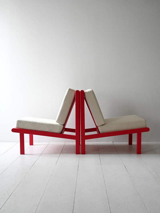Chaises longues des années 1970 avec des cadres laqués rouge cerise et des coussins récemment rembourrés en tissu neutre.