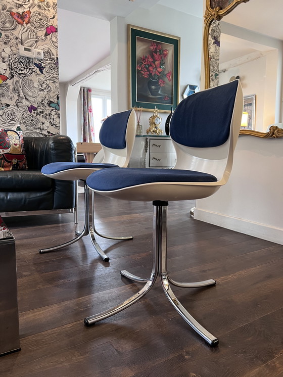 Paire de chaises vintage à coque pivotantes conçues par Martin Stoll et fabriquées par StollGiroflex dans les années 70 en Suisse. Au design futuriste et élégant de l’époque Space age, ces chaises intemporelles allient style et confort. L'une des caractéristiques de cette chaise réside dans son dossier et son assise reliés, une innovation pour l'époque. Ce système assure un confort ergonomique optimal, idéal pour les longues heures d'assise.