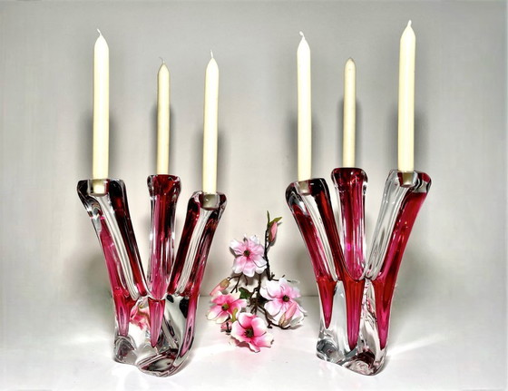 Superbe paire de chandeliers en cristal de la série « Tordus », datant du milieu du XXe siècle et conçus par René Delvenne pour Val Saint Lambert. Réalisés en cristal taillé rose canneberge à transparent, ils présentent un élégant design à trois branches aux formes libres et un pied creux. Chaque pièce est signée sous son socle. Fabriqués en Belgique, vers 1960.