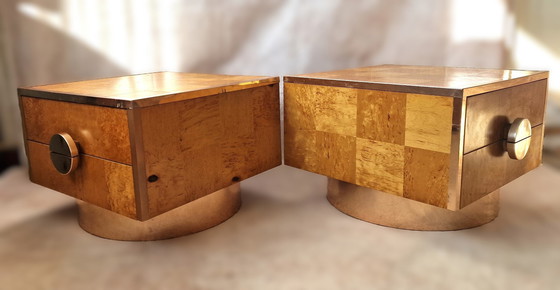 Rare ! Paire de chevets des années 70 dans le gout de willy rizzo. Ils sont en placage de bouleau de carélie et ornées de baguettes en métal chromées cuivré (légerement rosé). Ils ont assez lourd: environ 15kg chacun.
