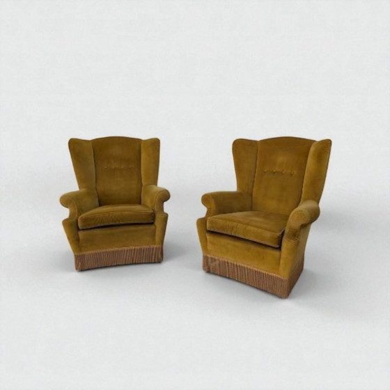 Paire de fauteuils en velours ocre, véritable exemple du design danois des années 1960. Dotés de pieds en bois, de franges décoratives et d'un dossier capitonné, ils dégagent une élégance rétro intemporelle. Le tissu est encore en bon état, avec quelques défauts mineurs sur les accoudoirs et un léger affaissement du rembourrage à l'arrière du dossier.