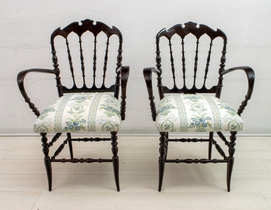 Cette paire de chaises Chiavari typiques avec accoudoirs a été conçue par Gaetano Descalzi dans la ville de Chiavari en Italie, où elles ont été produites depuis lors dans différents modèles.