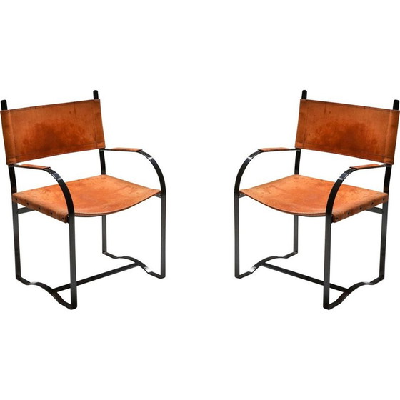 Chaises en acier laqué noir et en cuir cognac patiné, ensemble de 2, Belgique, années 1960. Un ensemble inhabituel de 2 chaises d'appoint, avec une assise en cuir épais et une structure en acier massif. Elles conviendraient parfaitement à un intérieur rustique et moderne, de style chalet.