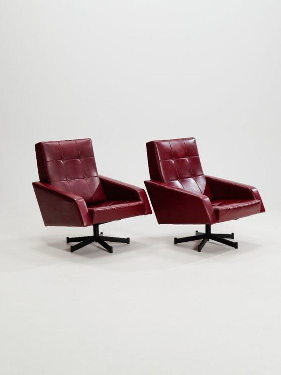 Fauteuils pivotants rouges de style moderne du milieu du siècle, avec revêtement capitonné, probablement des années 1960. Ce style se caractérise par ses lignes épurées, ses courbes douces et son design fonctionnel, souvent doté d'un piètement pivotant à 360°. Sans étiquette ni poinçon, il est difficile d'identifier précisément le fabricant, car de nombreuses entreprises ont produit des modèles similaires à cette époque.