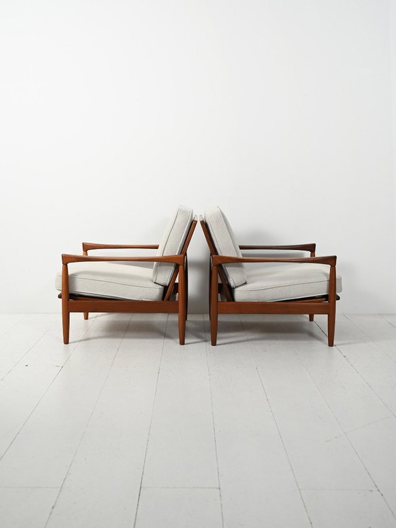 Élégante paire de fauteuils scandinaves, modèle « Kölding », conçue par Erik Wørts dans les années 1960, représentant une interprétation équilibrée du design danois moderne, axée sur le confort et la clarté des lignes. La structure en teck massif se caractérise par des lignes épurées et des proportions légères, avec des dossiers à lattes qui adoucissent visuellement le volume. Les coussins, entièrement déhoussables, ont été récemment retapissés d'un tissu beige très clair. Modèle recherché, apprécié pour son élégance discrète et le savoir-faire artisanal typique de la production de mobilier danoise de cette époque.