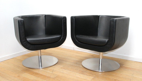 Paire de fauteuils tulipes b&b italia. Pied en fonte d'aluminium et assise en coque en cuir noir. Fauteuils rotatifs. Hauteur d'assise 44cm. Parfaits pour tous vos espaces de travail ou de maison.