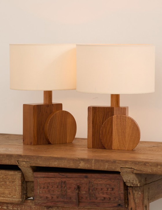 Paire de lampes artisanales géométriques en chêne massif circa 1970
